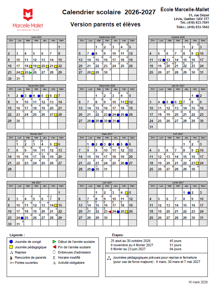 Calendrier scolaire 2026-2027